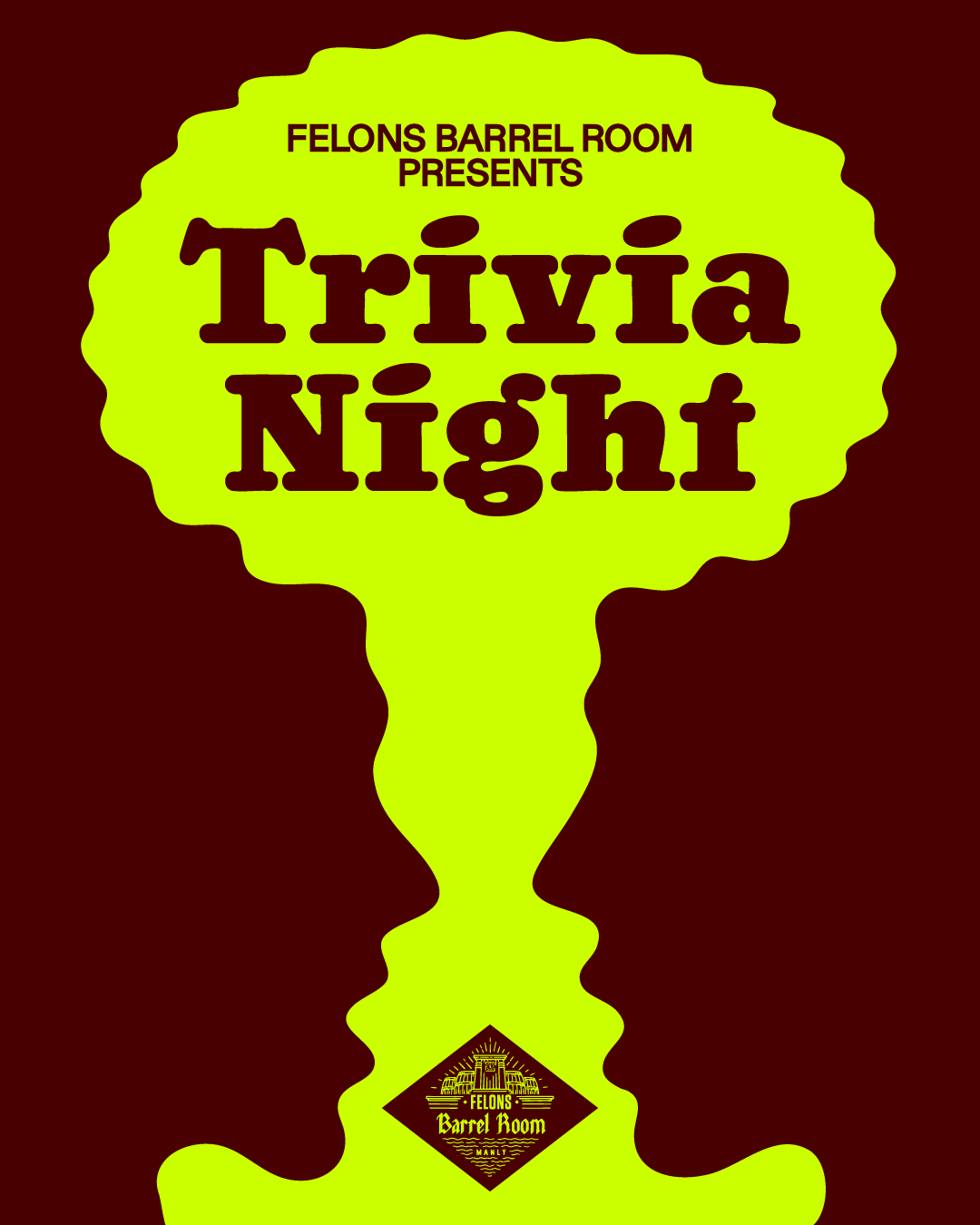 Join us every Wednesday from 7pm for Felons Barrel Room Trivia. Cash jackpot plus $25 meal and a free pint! Bookings recommended, walk-ins welcome.